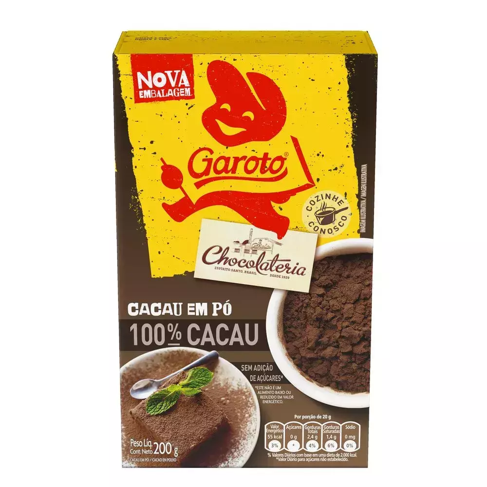 Chocolate em Pó 100 % Cacau da Garoto, acondicionada com precisão em embalagem de 200 g. Sem adição de açúcar e livre de glúten, este cacau puro exibe uma profundidade de sabor e um perfil aromático intensamente sofisticado, capaz de realçar sobremesas refinadas, mousses aveludados, cremes densos, recheios luxuosos ou como um polvilhamento final imponente sobre trufas e bombons gourmet
